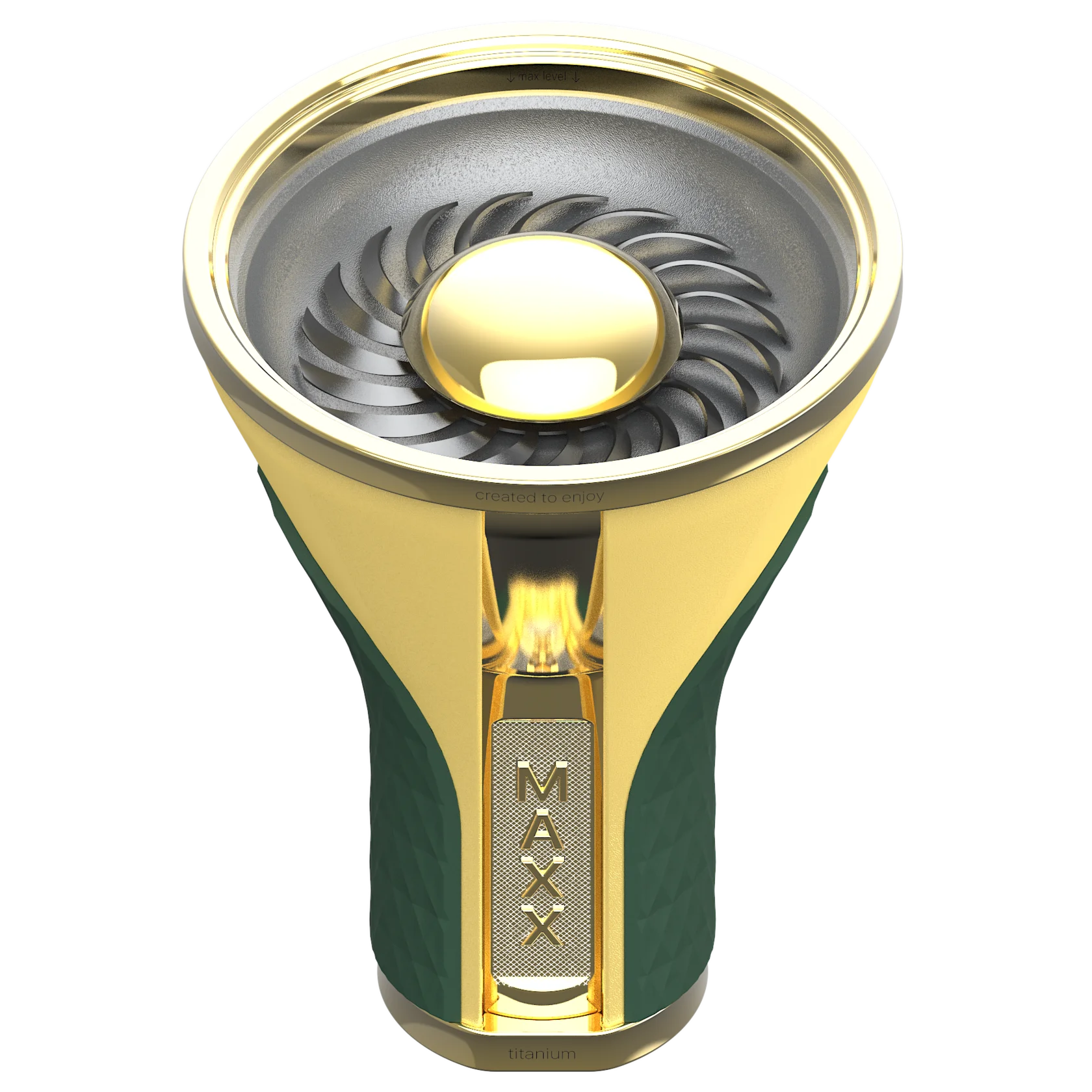 Elevate your hookah sessions with the Maxx Hookah Bowl in Emerald Gold—a fusion of cutting-edge engineering and luxurious design. Crafted from premium stainless steel, aluminum, and heat-resistant silicone, this bowl is built to withstand high temperatures while ensuring even heat distribution for a pure and flavorful smoking experience.